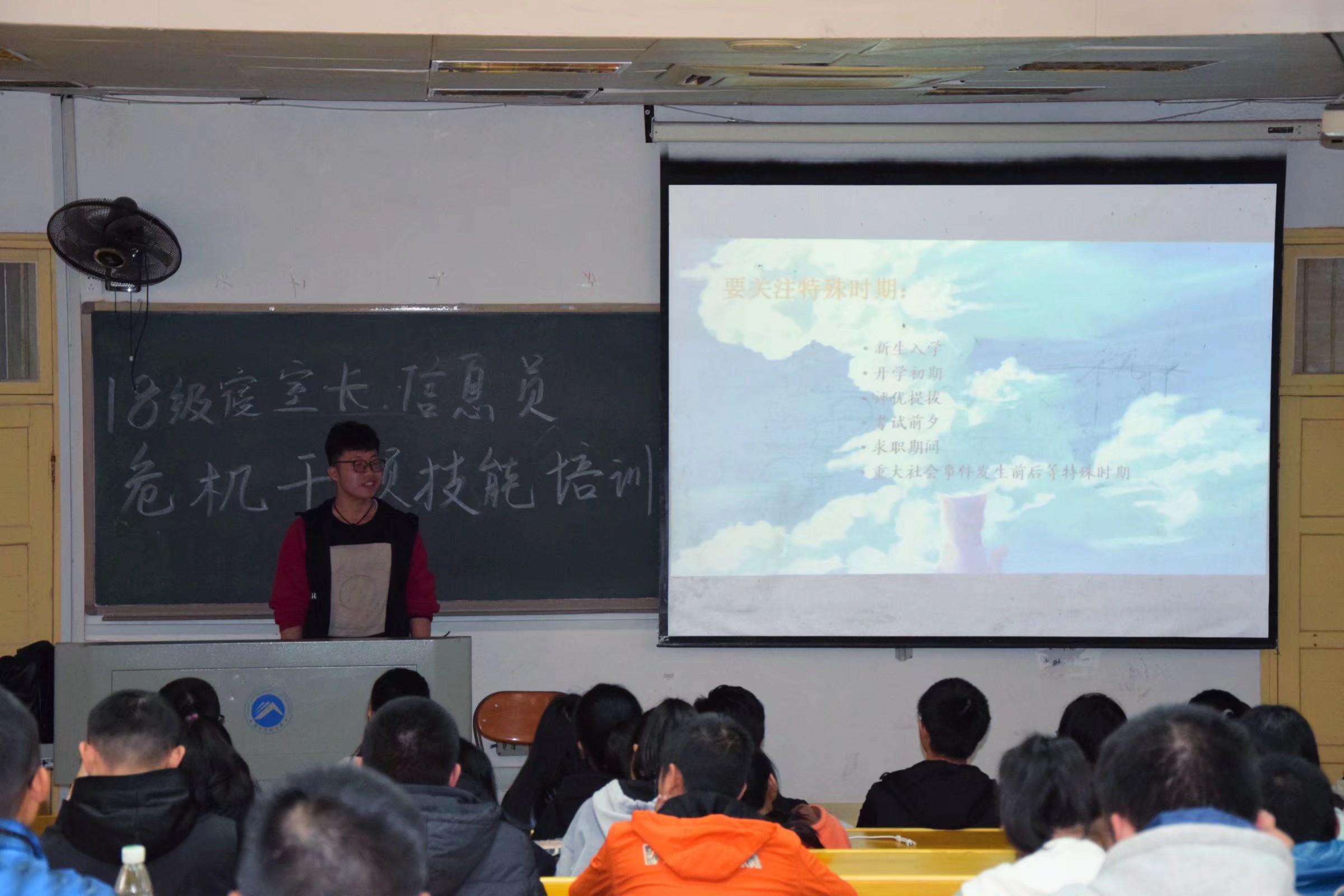 为了增强寝室长、信息员的心理健康意识,提高危机干预技能。我院于11月23日星期五下午4:00在十教东附楼103举办了2018级寝室长、信息员危机干预技能培训大会。我院2018级各寝室长与团支书以及受邀前来的生命科学学院团委学生会心健部部长、副部长参与了本次培训大会。本次培训大会由我院心健部副部长王明涛主持。