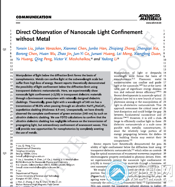 12月13日,我校3044am永利集团官网刘云新副教授在国际权威期刊《先进材料》(Advanced Materials,影响因子21.95)杂志上发表一篇题为《Direct observation of nanoscale light confinement without metal(纳米尺度光约束的直接观测)》论文。该研究前期相关研究成果在2013年发表《Angew. Chem. Int. Ed.》(影响因子:13.734)上,入选ESI前1%高被引论文。