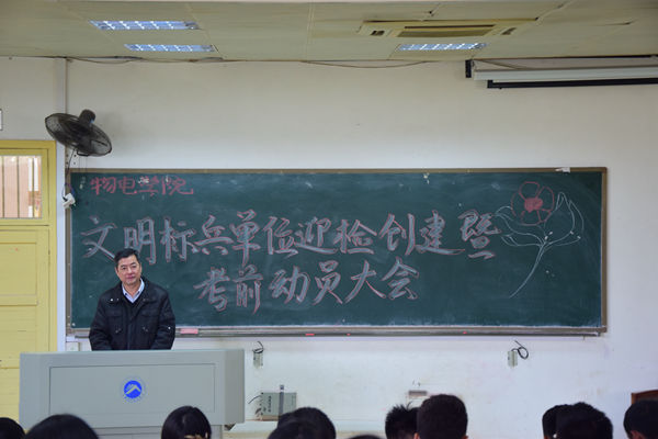 为落实好文明标兵单位迎检工作,进一步加强在校师生校园交通安全意识和良好考风考纪的建设,12月16日12:30,我院于十教附一202召开文明标兵单位迎检创建暨考前动员大会。院党委书记周文革、副书记邓辉及学工办吴秋霜老师出席此次会议。参加会议的还有院团委学生会各级干部和学院各班团干部。会议由学工办吴秋霜老师主持。